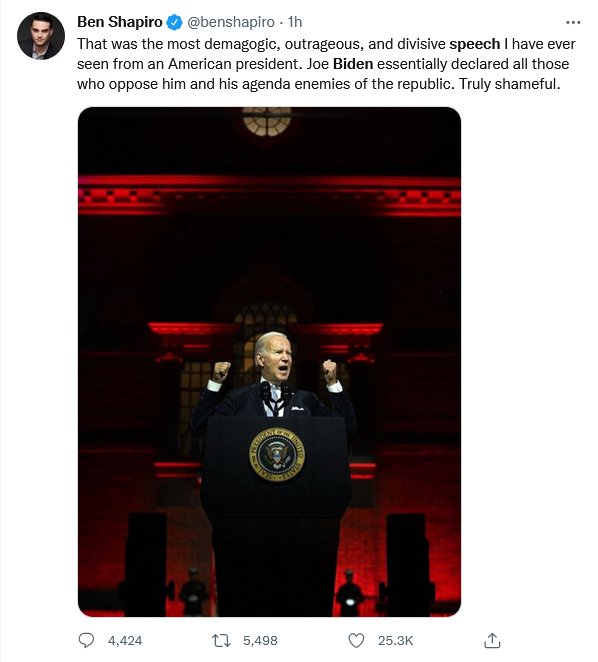 Tucker Carlson reacts to Biden's speech: "Yeah, 'they're a threat,' says the guy with the blood-red Nazi background and marines standing behind him. It's a complete outrage … This is truly nuts and threatening to the future of the United States." pic.twitter.com/SzmLiSMYzh