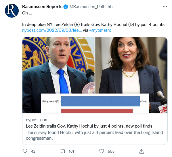 Just what we would expect to see in a Red Wave year, unexpectedly close elections in icy blue enclaves. Beginning to see this in the Colorado senate race, the Washington state Senate race and now in New York. In regard to the New York gubernatorial election it helps that Kathy Hochul is an unelected incumbent and has gained notoriety for hoof and mouth disease, a prime example telling New York Republicans recently to get out of the York State.