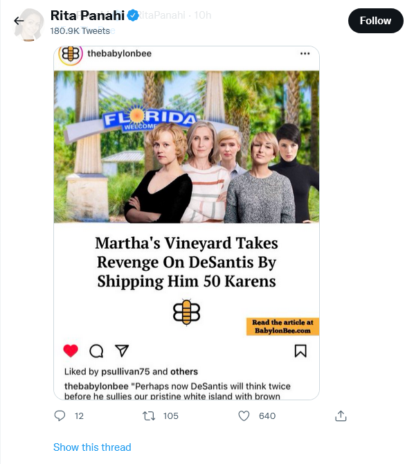 “Perhaps now DeSantis will think twice before he sullies our pristine white island with brown migrant people,” said Martha’s Vineyard HOA President Karen VonSchnitzel. “Once the charter flight filled with our neighborhood’s most insufferable Karens touches down in Tallahassee, he will rue the day he made us look like heartless racists in front of the entire country. HAHAHAHAHA!”