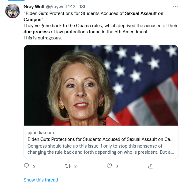 DeVos changed that. But now, Biden has reversed the DeVos rules and returned colleges to a standard that denies young men due process and makes it a simple matter to dismiss a student without even a fair hearing.