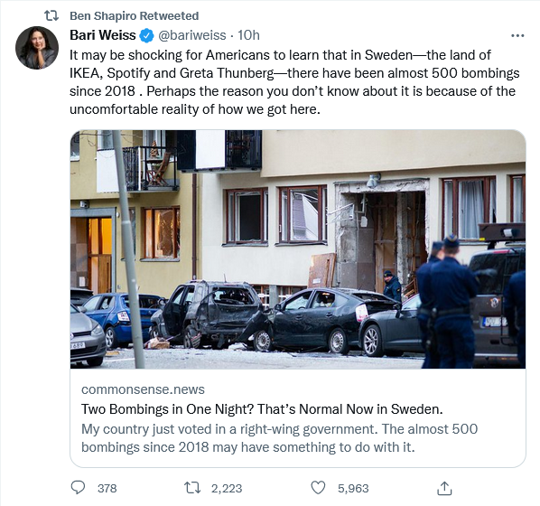 And some commentators are mystified why the Social Democrat Party government was voted out, and the populist Swedish Democrats will form part of the new center-right government. Crime and immigration were the major issues in the election. You do the math.