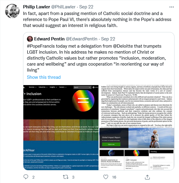 It’s also telling how Francis can’t even bother to deliver his trademark critique of capitalist excess when he has an audience with a multinational consultancy and professional services firm worth $60 billion. No critique of corporate compensation for abortion travel either.