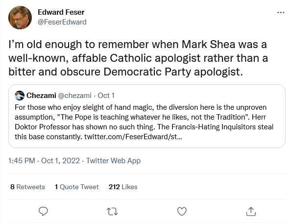 In the debate with Dr. Feser that I quoted he repeatedly backpedaled. Oh no, I never meant to imply that you wanted to kill as many people as possible when I said that anyone who defends the death penalty is a crazed monster even though I said it in direct response to your defense of the death penalty. That sort of thing. But inevitably Shea would devolve into more fanciful accusations about Feser being a bloodthirsty fake Christian Trump supporter, only to backpedal again when called on it.