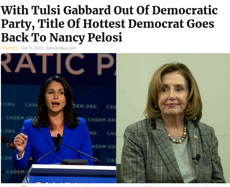 “Nancy Pelosi was always a close second in hotness to Tulsi Gabbard,” said Senate Majority Leader and sexiest male Democrat by unanimous vote, Chuck Schumer. “Some of us believe Pelosi to be even hotter, but we never had the grassroots votes to get her to the top of the podium.”