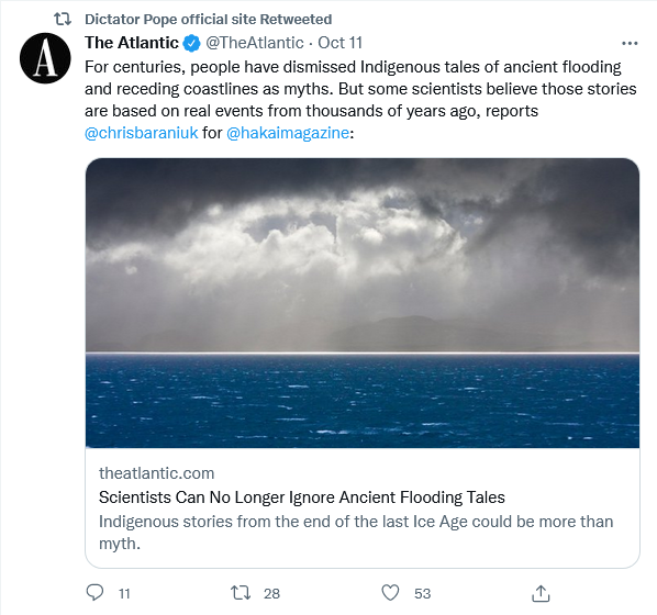 Or rather The Atlantic catching up. Historians have long noted that most cultures around the globe have accounts similar to Noah’s Flood. Most scientists, like Mr. Montgomery above, treat these accounts as merely evidence of localized floods. I wonder why such localized floods would be remembered. We have no world wide accounts of ancient great forest fires or ancient great earthquakes for instance. Regrettably we live in a time where too many scientists are wedded to a fairly fundamentalist belief in scientism and forget the humility contained in these words of Shakespeare: