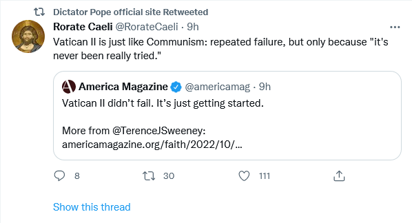 Mic drop. I heard an interview with that arrogant gas bag George Weigel. His defense of Vatican II was comical and false. He ignored all the downside of the council, trashed the Church before the council (you know all those religious who left after the council were thinking about it before the council), used really big words like syllogistic, and didn’t take any questions that might poke a hole in his thesis (not a surprise because the interviewer was Al Kresta). And, he falsely claimed the council was doctrinal. Quite simple, really. Just ignore your lying eyes.