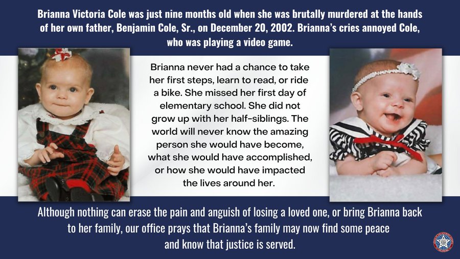 Brianna Victoria Cole was nine months old on December 20, 2002, a few days from her first Christmas.  Her father Benjamin Cole was playing a video game.  Brianna began to cry, which interrupted her father’s enjoyment of his video game.  In response he broke her back, and resumed playing his video game as she lay dying.