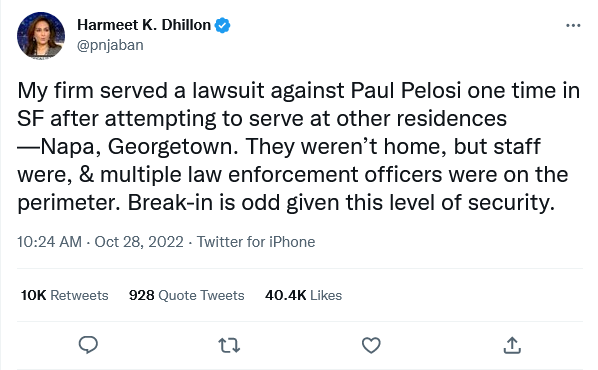 And, now, always reliable politico .com is reporting this morning that Paul Pelosi asked the alleged attacker if he (Pelosi) could use the restroom, from which he made the quote “wellness call.”