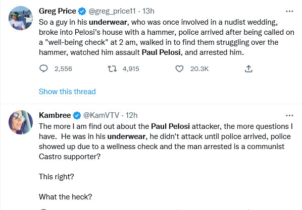 I think Steve Phoenix is right. This was a late night or early morning homosexual rendezvous that ended in violence. Nevertheless, I hope Paul Pelosi recovers. But I find both characters -perpetrator and victim – dusgusting.