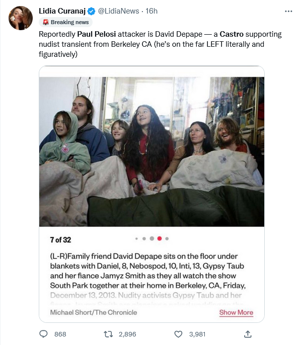 @ Ali Huebner: The citation you mention also points out that one of the alleged sources of income for David DePape was that he was allegedly known to be working as a gay prostitute. He has long been known in the Castro district as a Castro Street nude activist, where nude men openly walk around displaying themselves, and usually setting up tricks. So LCQ’s conjecture, unpleasant as it seems (which I was reluctant to assert), appears to be coming into clearer focus.