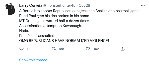 One thing that I noticed in the reporting on the incident was that none of the reports even bothered to discuss any evidence for concrete motivations for the attack. It was against Pelosi’s husband, therefore obviously the Republicans were behind it! Reminds me of the Gabby Giffords case where they instantly jumped not only to a Republican motivation, but said that it was caused by a specific Sarah Palin ad. If it had been a botched robbery, they would have still reported on it as caused by Repubilcans.