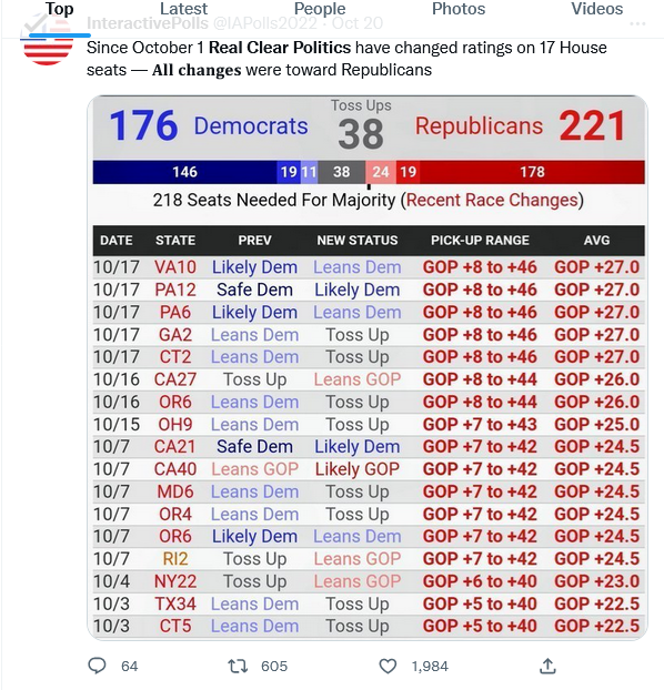 That said, I, too, fear the theft of at least one or two Senate seats, specifically PA and GA, and the governorships in PA and WI. If we manage to avoid those outcomes it could be a wave of historic proportions, indeed. It would be pretty impressive even if those thefts are pulled off in plain view again. Hoping the GOP learned something from 2020 and will have eyes where they need to be.