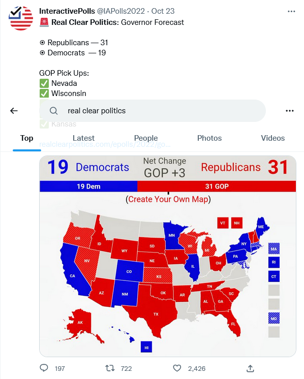 The GOP holds onto the governor’s office in Ohio, Georgia and Arizona and gets Kansas, Michigan and New York. The Dems will win Maryland, but Hogan was a fake Republican anyway.