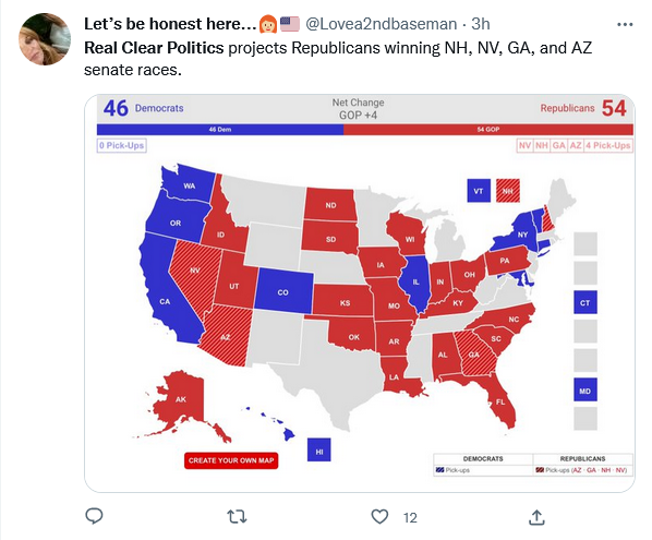 The GOP could end up with 55 or 56. My worthless projection is that the GOP holds onto Ohio, Pennsylvania and Wisconsin and wins in Georgia, Arizona, Nevada and New Hampshire, with a shot at Washington State and Colorado. Chuck Schumer is out as Senate Majority Leader and the GOP needs to dump McConnell.