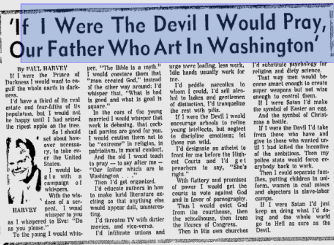 Don Surber takes a look at Paul Harvey’s brilliant 1965 “If I Were the Devil” and nails it: