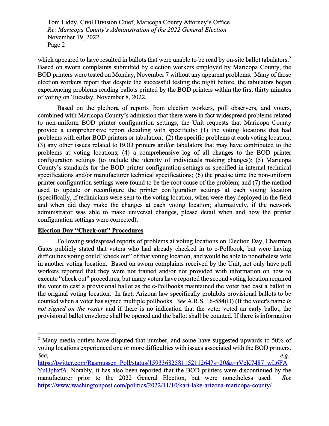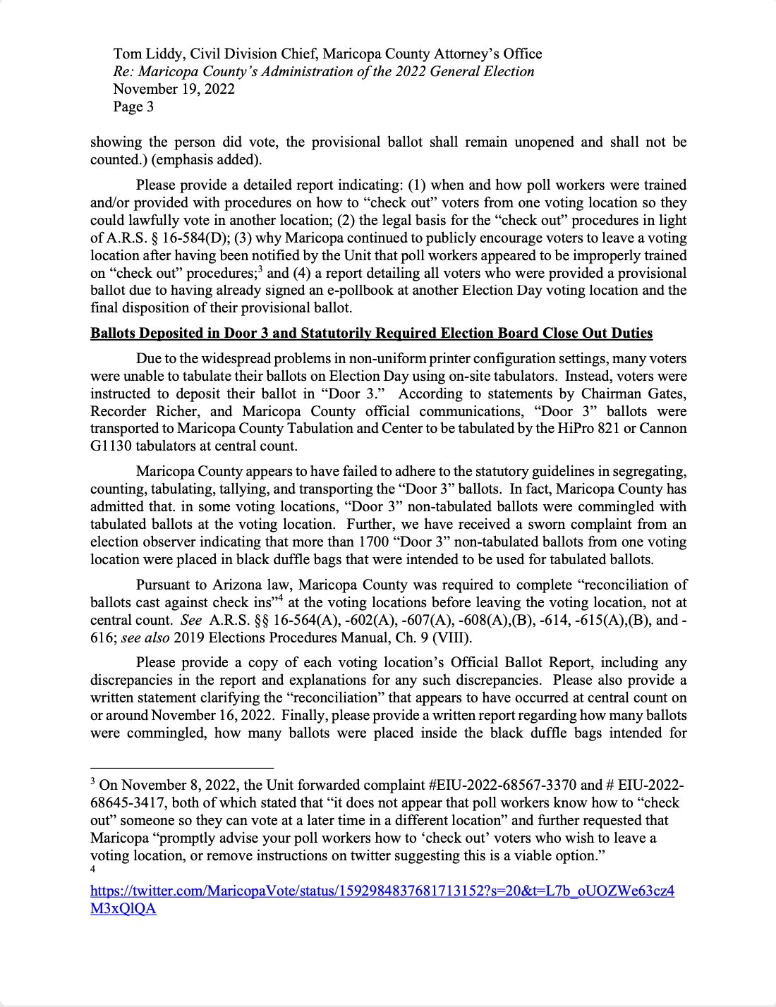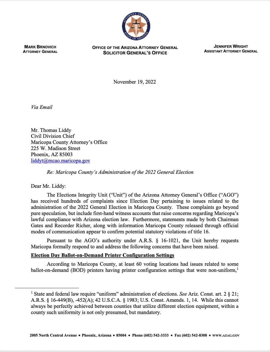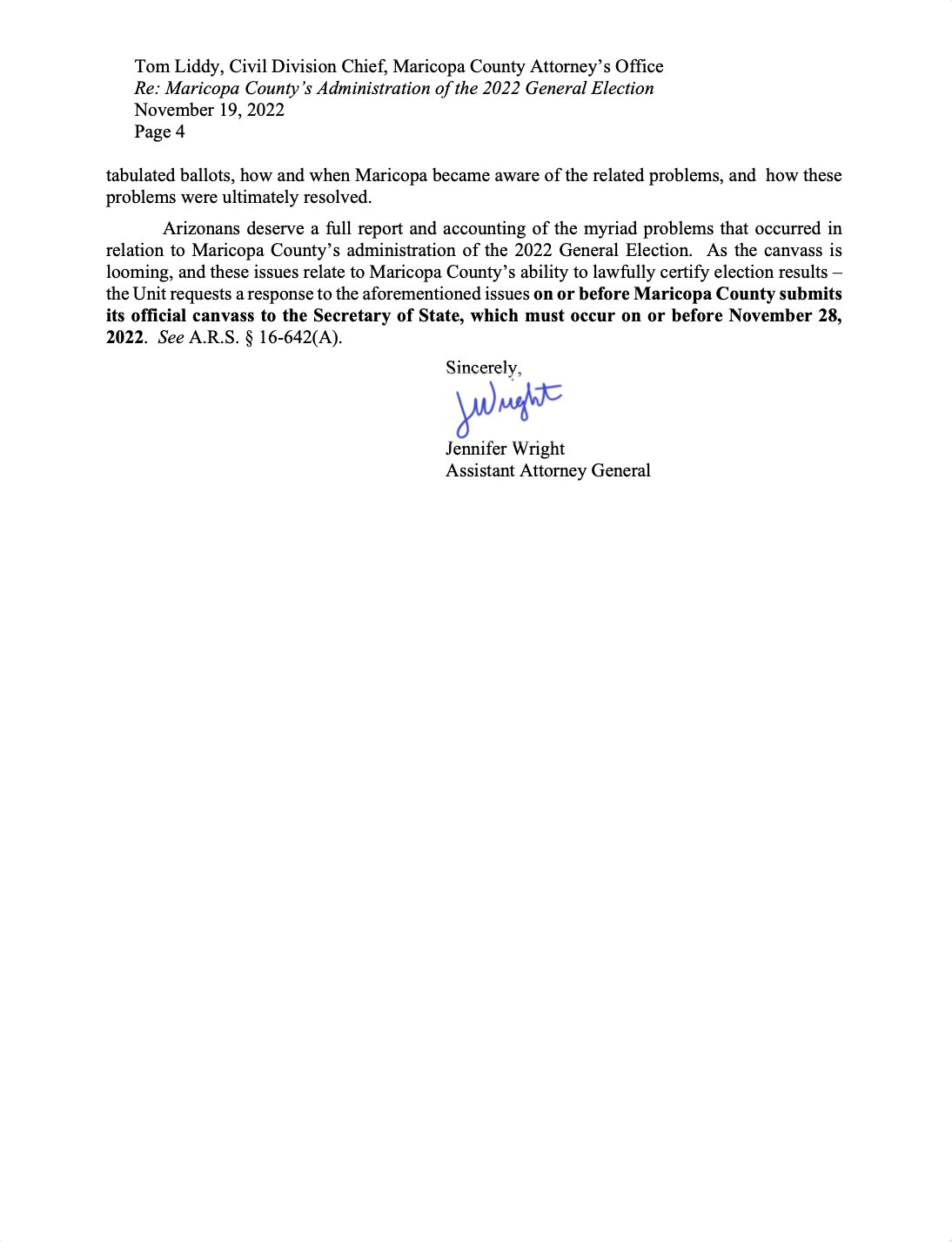 Tom Liddy, the attorney at Maricopa County Civil Litigation Division to whom this letter was addressed by the Asst AZ AG Jennifer Wright, has been taped displaying his typically belligerent manner, going off in a conversation with a Lake Campaign attorney (the best way to deal with Tom Liddy, by the way: tape everything.). Liddy, the son of the late G. Gordon Liddy, and who was tapped at one time for a position fairly high up by then-chair Haley Barbour for the NRC, has a long history of being explosive and intemperate and not slowing down to deal with the facts, “just the facts, ma’am.”