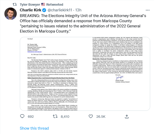 What went on here was a takedown of Kari Lake by people inside the system who knew how to do it. Maricopa County’s election operations are manifestly corrupt. Gates after all first told the public on election night there were 450,000 uncounted ballots. Later on he said 472,000. The next day he said “over 500,000.” It now appears somewhere between there showed up between 600,000 and 800,000 uncounted ballots after 8 PM on election day. Where did all these ballots come from? They admit they have no chain of custody. Anytime an election count goes on more than 6 hours after the polls close, and the accurate number of remaining uncounted ballots cannot be immediately known, one can be sure that illicit ballot-stuffing is happening. This is in addition to Gates himself admitting that uncounted ballots were commingled with counted ballots, making it certain that they couldn’t be later distinguished at “Door 3” and strongly likely large numbers of ballots were never counted. After all more than 60% of the 60-70 Maricopa precincts had extensive tabulator counting problems.