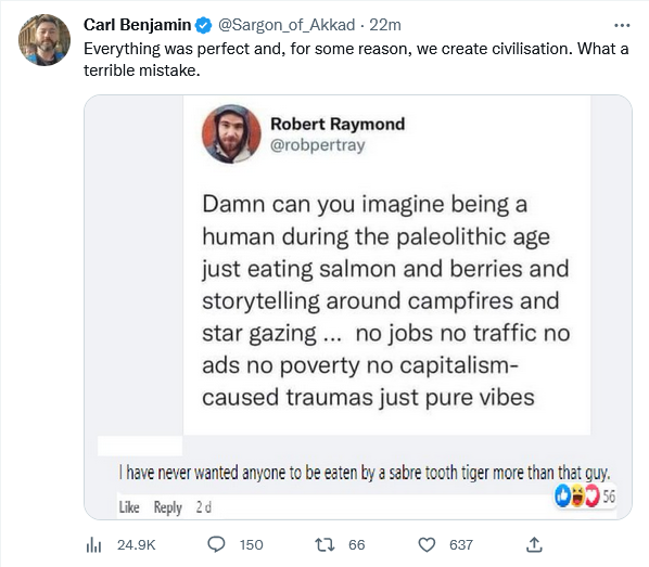 That damn fool wouldn’t last two days in a modern day forest, let alone the Paleolithic age.
