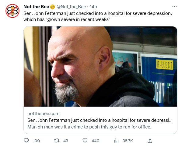 Another argument against ‘early voting’. Some Fetterman voters have the excuse that his impairments weren’t glaring until after they’d cast their ballot. (Not many. Most partisan Democrats respond to the abuses of their party by (1) pretending it isn’t happening or (2) making the most absurd excuses for it).