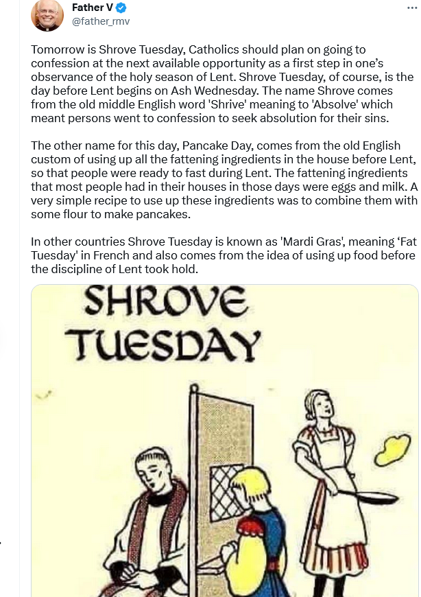 Thank you! DH is a cradle Catholic and had never heard of Shrove Tuesday and could not understand why I wanted to go to IHOP today, Tuesday, as oppose to Thursday–which would be a more convenient day to go (except we are likely to be iced in on Thursday.)