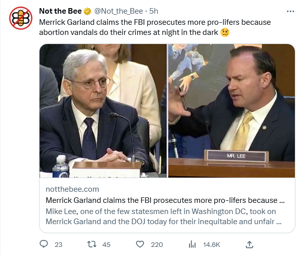 Indeed. What an incompetent AG. Just like his boss, Heard most of the questioning on the radio. Senator Hawley had a picture of the armed SWAT team with a battering ram that descended on the pro life activist, his wife, seven children. Garland denied what was before his eyes. He seems not to know the law or the organization of his DOJ. He’s just a placeholder drawing a nice salary. Proud of our senators. Time to question the Deputy AG and on down if need be like the head of the US Marshal Service.