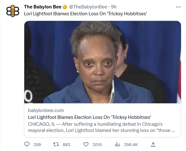CHICAGO, IL — After suffering a humiliating defeat in Chicago’s mayoral election, Lori Lightfoot blamed her stunning loss on “those tricksy hobbitses.”