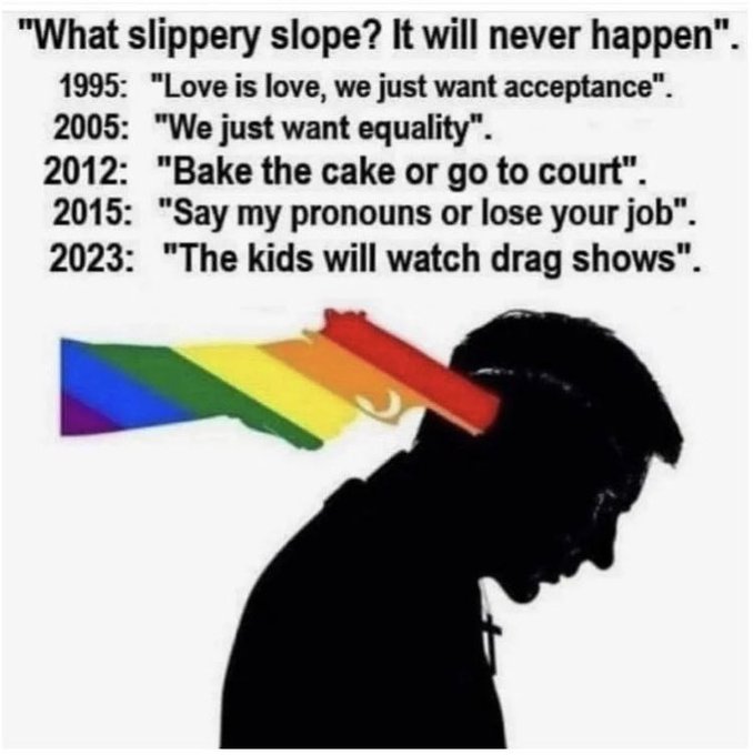 What’s ironic about the slope we’re sliding down is that they’ve come full circle with the “gender ideology” nonsense. Now they’re saying that if you’re an effeminate boy, you need to cut your penis off to become a girl; if you’re a tomboy, you need a double mastectomy and a pseudo phallus to be a man. Thus, the Left is saying, their is no spectrum of sexuality and you’re either one gender or the other, regardless of your body. They are invalidating homosexuality in pursuit of a more radical, yet more conformist, position. They truly are insane.
