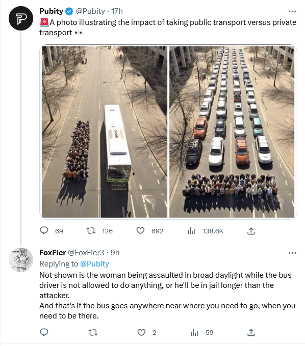 I don’t know, that seems a pretty lame burn. I think of a local story a couple weeks ago about a young woman killed on the way to her car in a shopping center parking lot. I’m personally fine with public transportation. Especially when I’m marathon driving the freeway at rush hour.