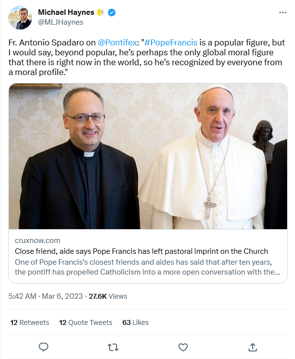 It’s probably true that he’s the most prominent global moral figure. Greta Thunberg, Bill Gates, President Zelenskyy, and Elon Musk likely round out the top five.