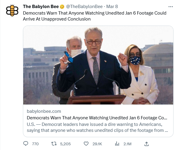 “This is a very dangerous situation,” said Democrat Senator Chuck Schumer. “We work hard every day to make sure Americans all have all the correct opinions. With thousands of hours of footage being given to the American public with no filter, we’re in grave danger of some people not agreeing with us, or worse — not giving us politicians more and more unchecked power. This is an existential threat to democracy.”