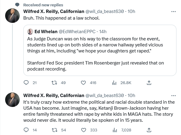 The Courts of Appeal and District Courts in our Federal Judiciary are infested with Judges who share the views of these scum. You are getting a preview of your future lawmakers. Their views are reinforced by their professors. For the majority, their views will not change. We now face the probable “lynching” of a former President next week. I fear the division in this country is now too great for it to remain as one. Seeking justice has become an exercise in political views rather than a search for truth. As a lawyer for 50 years, I am ashamed (but not surprised) at the behavior of these people at a so-called top tier law school.