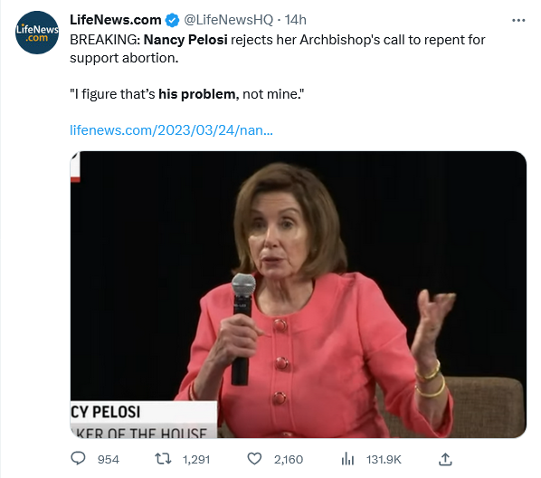 Pelosi knows exactly what she is doing. Pelosi does not worship God. She worships another supernatural being. There are others like her who have sold their souls. Judas set the precedent. So you can’t reason her beliefs as being someone who is misguided or the like. Her choices are very much aligned to that of Satan. She should have been excommunicated a long time ago. That’s on her Bishop.