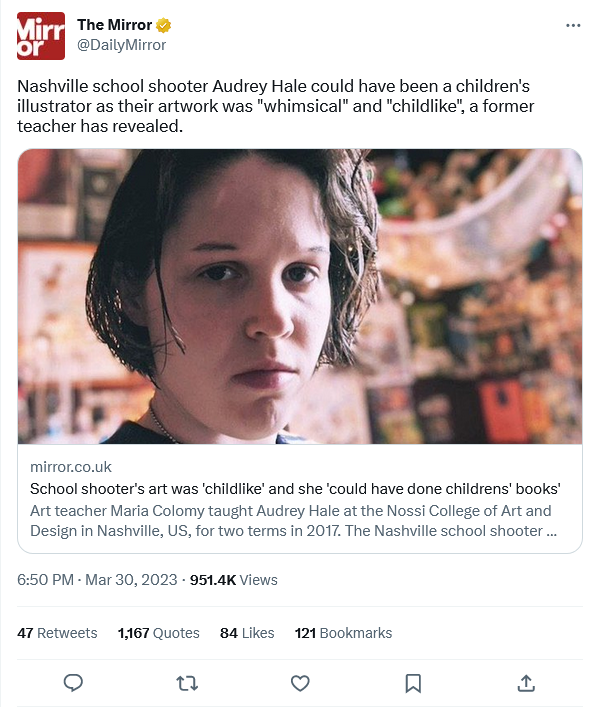 The more you read about this woman, the more you can see her life was a study in failure-to-launch. She would have been of an age to complete high school in 2012 / 13. She’s enrolled in art classes in 2017. She’s granted her diploma in 2022. It’s a tiny stand-alone art school originally founded as a commercial enterprise. She lived with her parents. Evidently she’d had a side job in recent years working for a grocery store or delivery service. Her relations with her peers were so truncated she was obsessing on social media about a schoolmate of hers from 15 years back. (The schoolmate was killed in an automobile accident last summer. The family said Audrey Hale appeared at the funeral and some other memorial event but they otherwise had not seen hide nor hare of her in years; the two women were not friends). She was monitored by a member of the mental health trade; the smart money says the mental health trade has been a presence in her life since early adolescence and that she’s had courses on at least four psychotropics over the years. Declaring herself a male was just another doubling-down on dysfunction.
