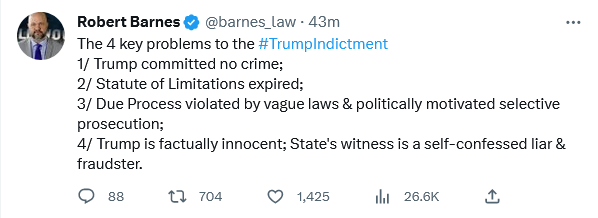 Barnes is an idiot whose understanding of the law is almost as bad as his election predictions. Trump’s indictment is indefensible, but I’d sooner take my legal insights from somebody with a less spotty track record.