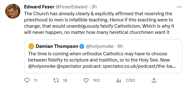 In his podcast, Thompson says that JPII’s apostolic constitution Ordinatio sacerdotalis fell short of being an infallible statement.