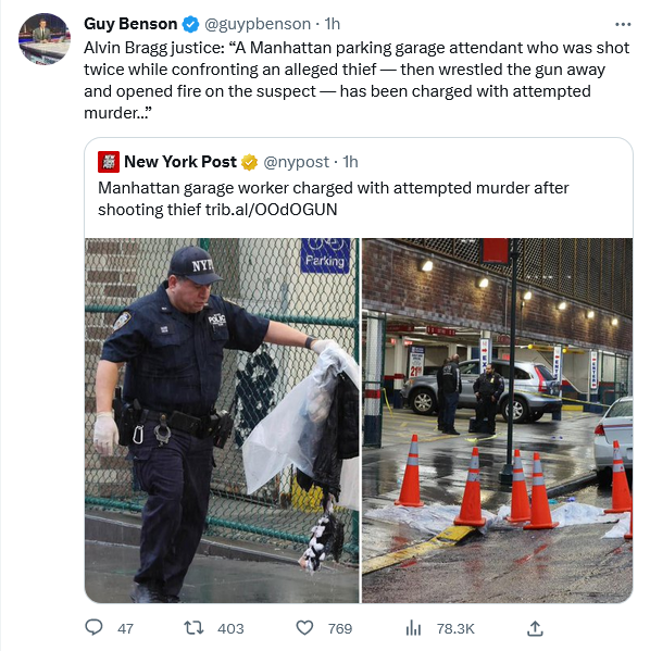 I wonder if Bragg even knew about this case, as he likely has peppered the staff with orders and memos about how they are to proceed in their continuation of the undoing of all the good Rudy Giuliani’s policies accomplished. One part of me recoils in horror at what is happening to NYC and to the innocents like this garage attendant. The other, less Christian, part of me says “You voted for him, now get what you wanted, good and hard, and deal with it.” Maybe Mr. Bragg shouldn’t have been in such a hurry to make himself the center of attention. Time will tell.