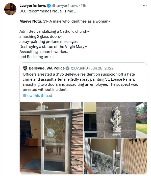 For a start – Maeve, what ever name it wants to call itself – is a he. Call him by the gender he was given by God at birth. Don’t afford him the luxury to identify as he wants. That’s where we should begin. Secondly, I hope and pray the Church and the Church employee sue the pants off him. Sometimes, $$$ is the only thing people understand. It’s going to cost someone $$$ to fix the damage he did. None of this, “let’s be Christian and pray for them and God will sort it out” rubbish. God wants us to sort it out, and he will help us along the way. And don’t worry, at this point, my prayers are that some sane individual locks him up indefinitely so he can’t repeat his deranged violence. Prayers your way Maeve.
