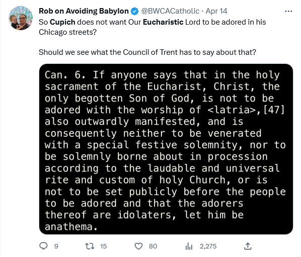 His Real Presence outside of a Mass somehow detracts from our necessary mindfulness of the communal dimension of our faith—- then it seems to me that following his “logic” Cupich should also decree that the Catholics of the Chicago Archdiocese should also refrain from any private reading of scripture outside of a Mass. After all, adoring and contemplating Our Lord outside of Mass is bad and undermines our community somehow…