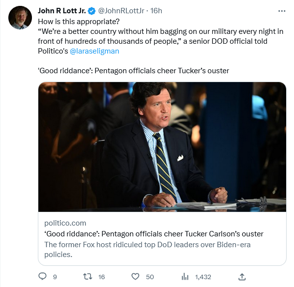 Given Tucker Carlson’s loudly stated views on Ukraine, I am no fan of his and could not care less about Fox letting him go. TVP World has lumped him in with the blowhards on Russian state television.