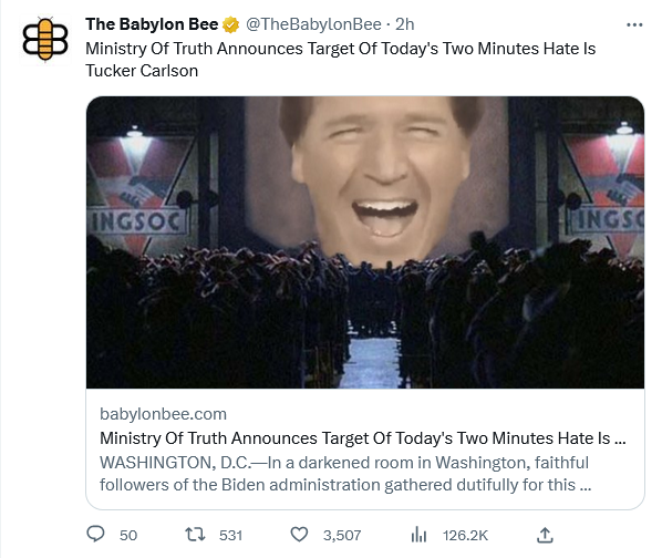 The Two Minutes Hate crescendoed in wild jeers, hissing, weeping, and gnashing of teeth as the screen proclaimed, “TUCKER CARLSON: PUBLIC ENEMY NUMBER ONE,” and all the gathered journalists and other Party members rushed the stage in a frenzy to tear down the image of Carlson, though they didn’t do much damage, not having much upper body strength.