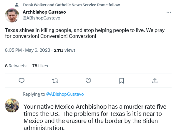 But Archbishop Gustavo is happy to hold the office of Archbishop of San Antonio Texas with all its perks and benefits. Looked after very well, I imagine, by the archdiocese in Texas. He is welcome to move back to Mexico if the grass is greener.