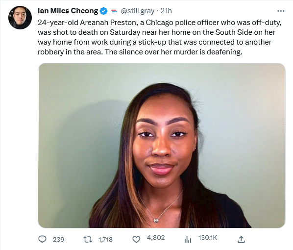 May her soul rest in peace.  Overwhelmingly homicide black victims have their lives taken by other blacks, usually engaged in crime.  You hear little of this fact, because Democrats and their media auxiliaries constantly stir the evil pot of racial hatred, and this fact does not serve that effort.  No attention is paid, and no effort is made, to solve this, as it could largely be solved, through increased policing and putting predators away for long prison terms.  Instead, the police are depicted as the enemy and predators are portrayed as innocent, misunderstood lads who must be kept out of prison at all costs.  Thus the innocent die, mendacious politicians reap votes and our cities become dangerous cesspools.