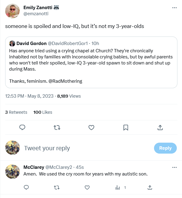 A cry room is nice to have if parents want to use it. I always sympathize with the young moms and dads at our parish, which doesn’t have such a room, when they have to take a noisy youngster out to the narthex to quiet down. But as I’ve said here before, I am thankful to have a parish so loaded with young families that we have this “noise issue.” A parish without young children is on the road to oblivion. This should be obvious, even to self-styled experts like the fool who posted that rant.