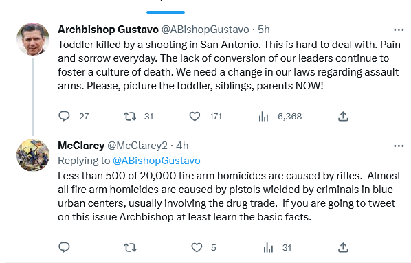 One very good reason for clerics to stay off of social media is how many come across as utterly clueless. Here we have the Archbishop of San Antonio mindlessly repeating the gun control mantras of the Left and obviously either ignorant of basic facts or completely indifferent to them. This raises the suspicion that in matters of faith he may be equally ignorant or mendacious.