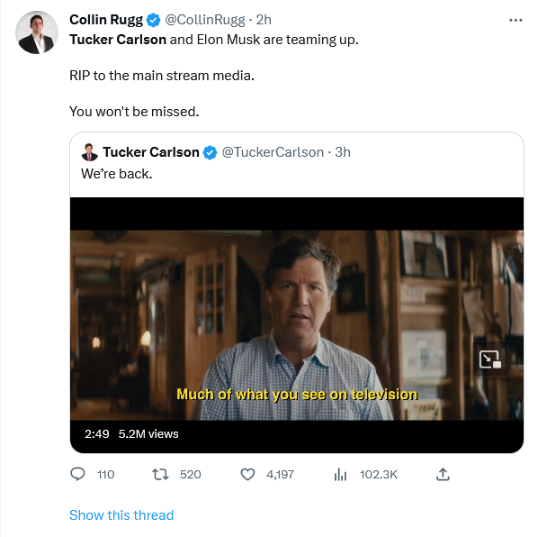Huge score for Musk! I wonder if he signed Carlson to an exclusive deal?