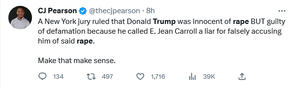 Something to remember when watching these affairs is that the leftists pursuing them do not care at all about the merit of the arguments, only that they hit Trump. The slew of attacks from every angle make clear. So YOU might think that one particular attack has more merit, but the people behind the attacks don’t care. The only relevance that the merits have are to some jury members, and as this case shows all that will prevent them from doing is making the most blatantly false verdicts (such as saying that a rape occurred when it can’t be proven that the two involved even met each other.)