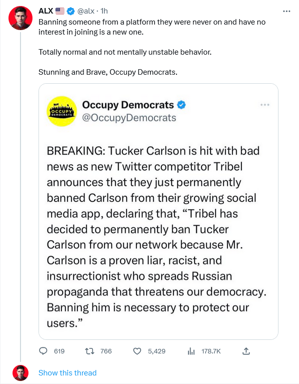 Talk about lack of self-awareness. Tribal is the perfect name for Leftists who only want to talk to each other anyway. Calling your own platform “Tribal” is its own “Burn of the Day”.