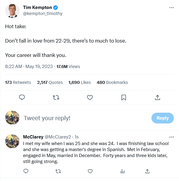 NB, the ‘your career’ hoo ha is nonsensical outside of the fancy professions and management. Well, 88% of the working population is not employed in either and even within that 12% you have honest craftsman who want to earn a living and have quite circumscribed ambitions. Even among the ambitious, you find people who were married throughout. The current Chairman of the Joint Chiefs of Staff married at 27, as did the CEO of JP Morgan Chase.