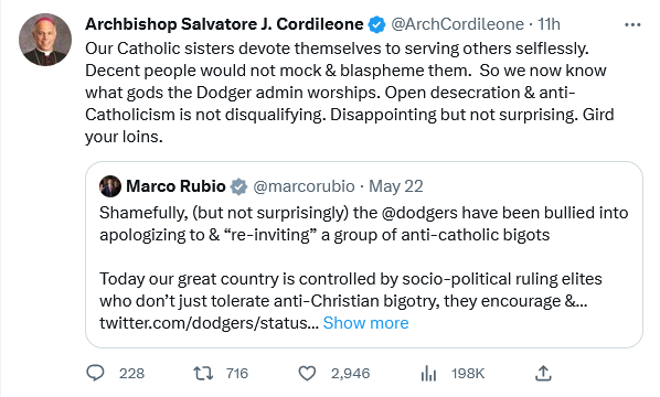 Beelzebub means Lord of the Flies. The sisters of perpetual ignorance are coming. The Dodgers’ competition ought to refuse to play by such evil rules.