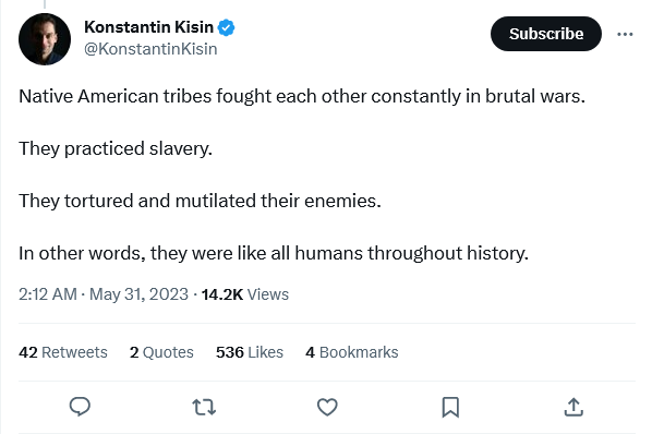 Funny, in high school and college (1980s), a common theme in various social studies courses I took was ‘sure the West was a net positive for the world, but in the end we were as capable of doing bad as everyone else.’ Now we see it said ‘sure, but they were sometimes as bad as us.’ Lots of big changes in thinking in that little switch around.